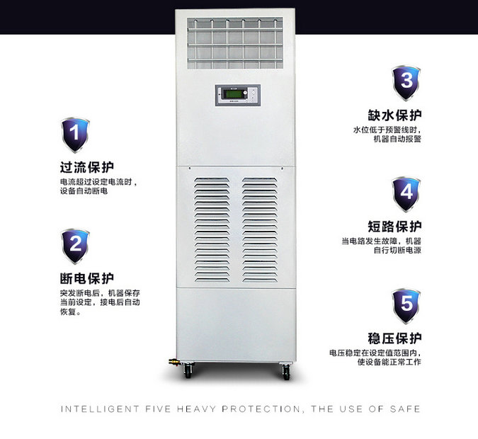 1. Microcomputer fully automatic control, real-time display of operating humidity, and can view the ambient temperature. The precision range is ± 3% RH, and the setting range is 20% - 95% RH. It has the control function of timing off humidification and appointment opening humidification. < br / > 4. One button cleaning function, automatic cleaning, drainage and sewage discharge. < br / > 5. Perfect system fault automatic diagnosis function, better maintenance of the machine. < br / > 6. The automatic and manual water inflow modes are optional, and the system is equipped with water level detection device, with water shortage and full water alarm and shutdown function, and overflow protection function to realize safe water level operation. High, medium and low wind speeds are adjustable and can be freely selected according to needs. < br / > 8. With swing air function, it can automatically adjust the air supply angle. It has two working modes: humidification and ventilation. When humidifying, it has double effects of humidification and cooling. It has the advantages of high efficiency, energy saving, environmental protection and low operation cost.