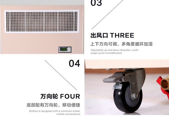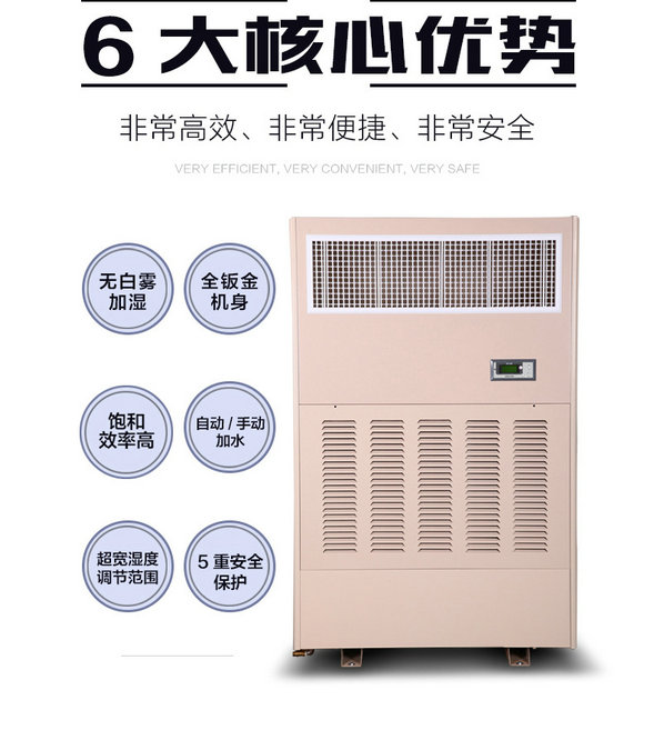 1. Microcomputer fully automatic control, real-time display of operating humidity, and can view the ambient temperature. The precision range is ± 3% RH, and the setting range is 20% - 95% RH. It has the control function of timing off humidification and appointment opening humidification. < br / > 4. One button cleaning function, automatic cleaning, drainage and sewage discharge. < br / > 5. Perfect system fault automatic diagnosis function, better maintenance of the machine. < br / > 6. The automatic and manual water inflow modes are optional, and the system is equipped with water level detection device, with water shortage and full water alarm and shutdown function, and overflow protection function to realize safe water level operation. High, medium and low wind speeds are adjustable and can be freely selected according to needs. < br / > 8. With swing air function, it can automatically adjust the air supply angle. It has two working modes: humidification and ventilation. When humidifying, it has double effects of humidification and cooling. It has the advantages of high efficiency, energy saving, environmental protection and low operation cost.