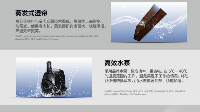 1. Microcomputer fully automatic control, real-time display of operating humidity, and can view the ambient temperature. The precision range is ± 3% RH, and the setting range is 20% - 95% RH. It has the control function of timing off humidification and appointment opening humidification. < br / > 4. One button cleaning function, automatic cleaning, drainage and sewage discharge. < br / > 5. Perfect system fault automatic diagnosis function, better maintenance of the machine. < br / > 6. The automatic and manual water inflow modes are optional, and the system is equipped with water level detection device, with water shortage and full water alarm and shutdown function, and overflow protection function to realize safe water level operation. High, medium and low wind speeds are adjustable and can be freely selected according to needs. < br / > 8. With swing air function, it can automatically adjust the air supply angle. It has two working modes: humidification and ventilation. When humidifying, it has double effects of humidification and cooling. It has the advantages of high efficiency, energy saving, environmental protection and low operation cost.